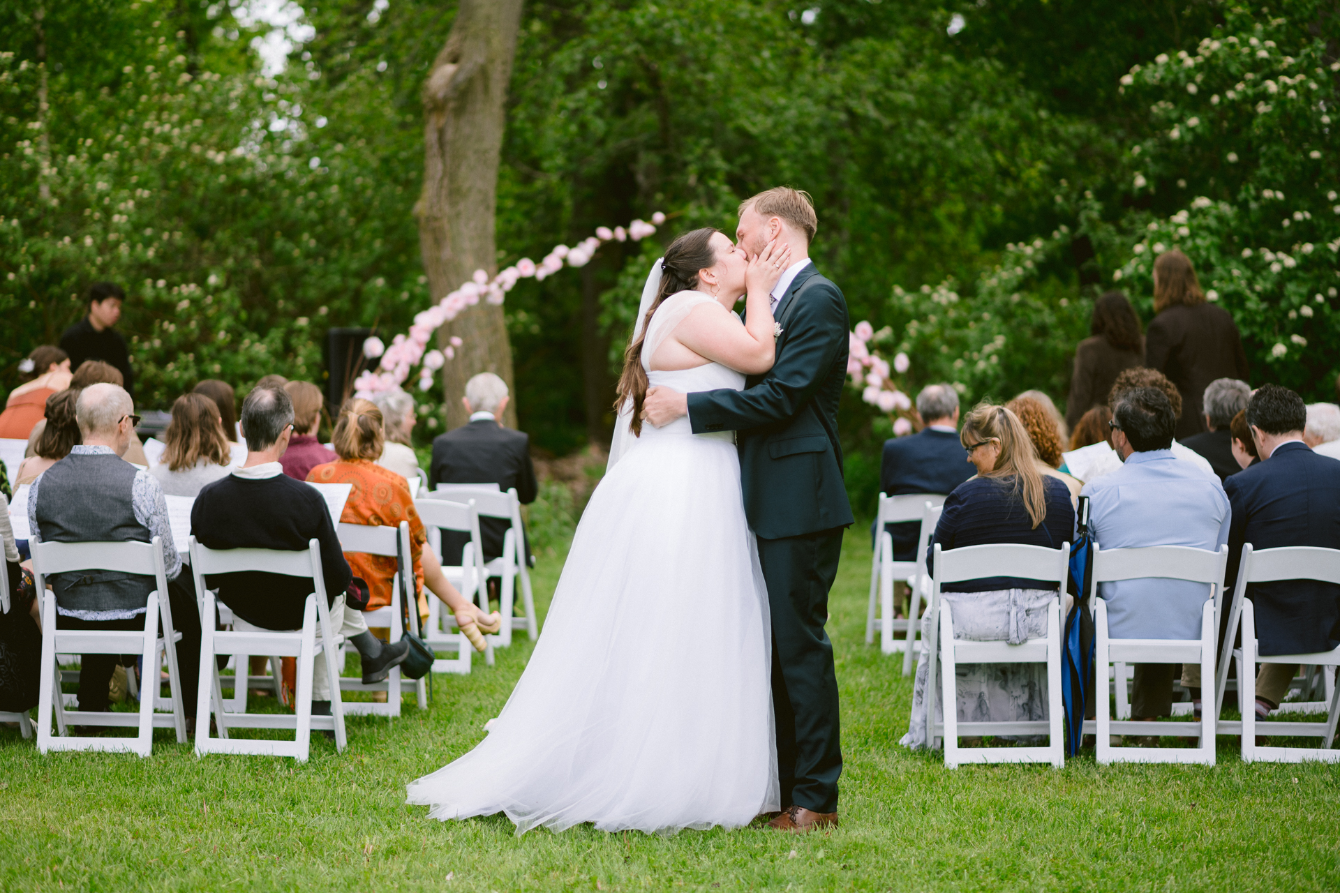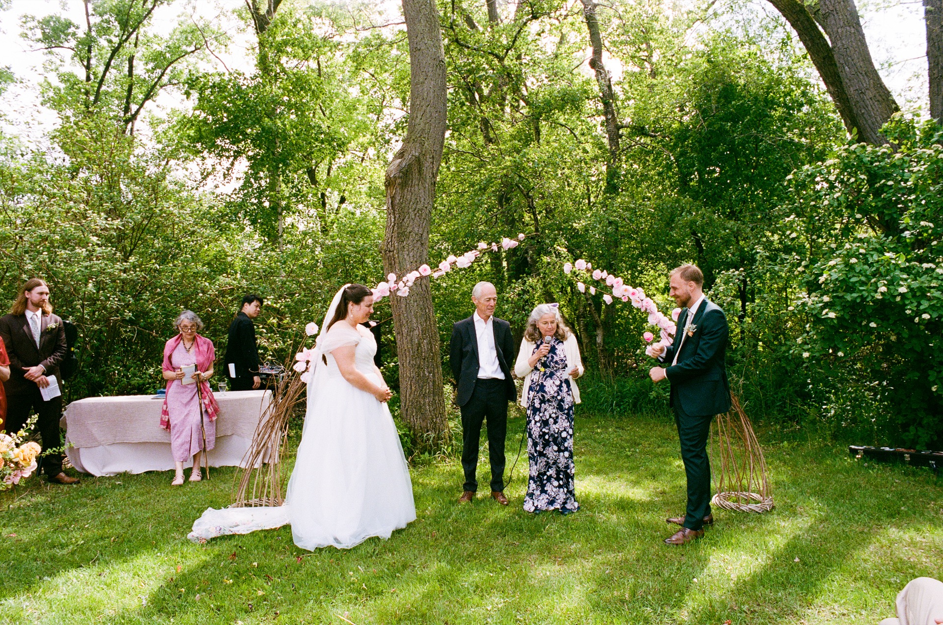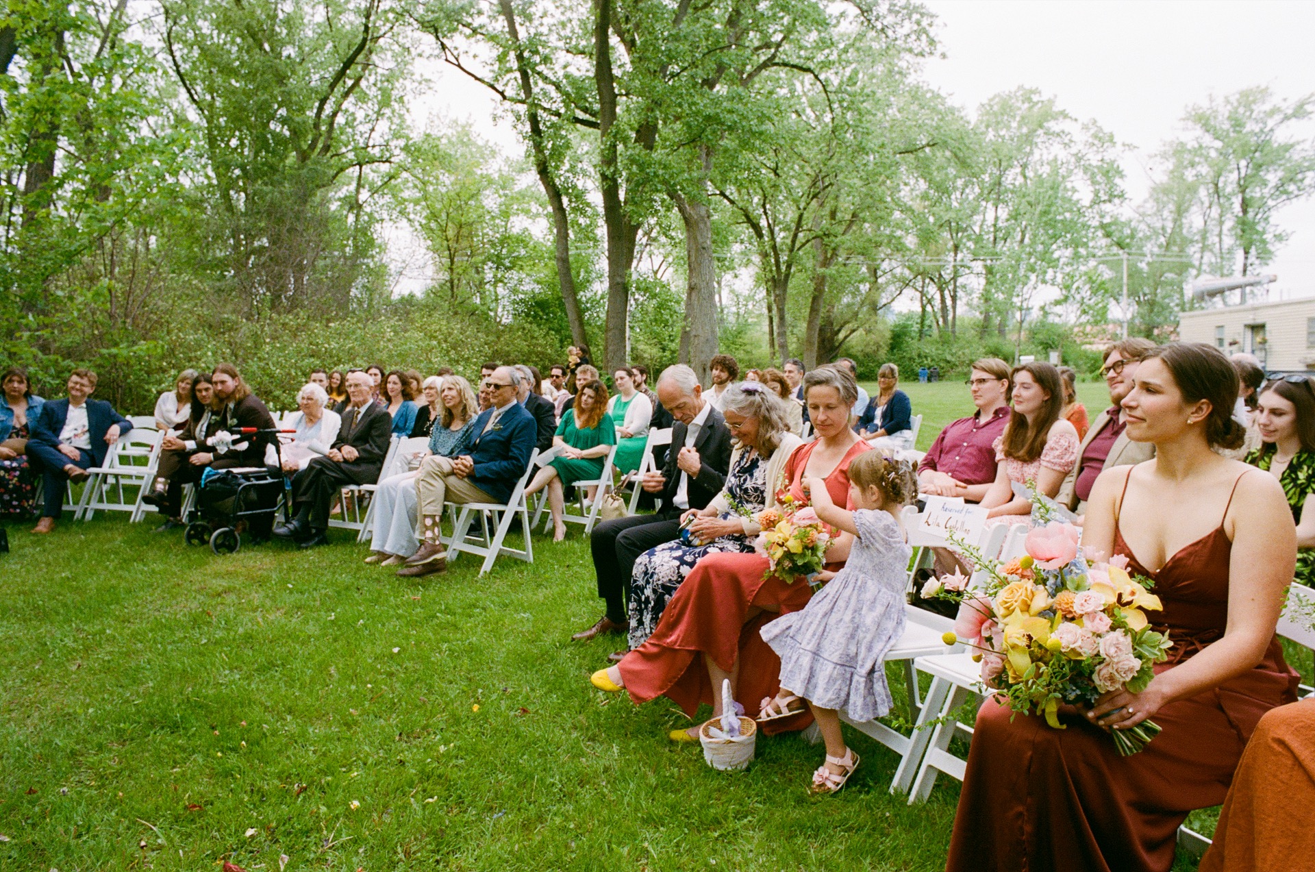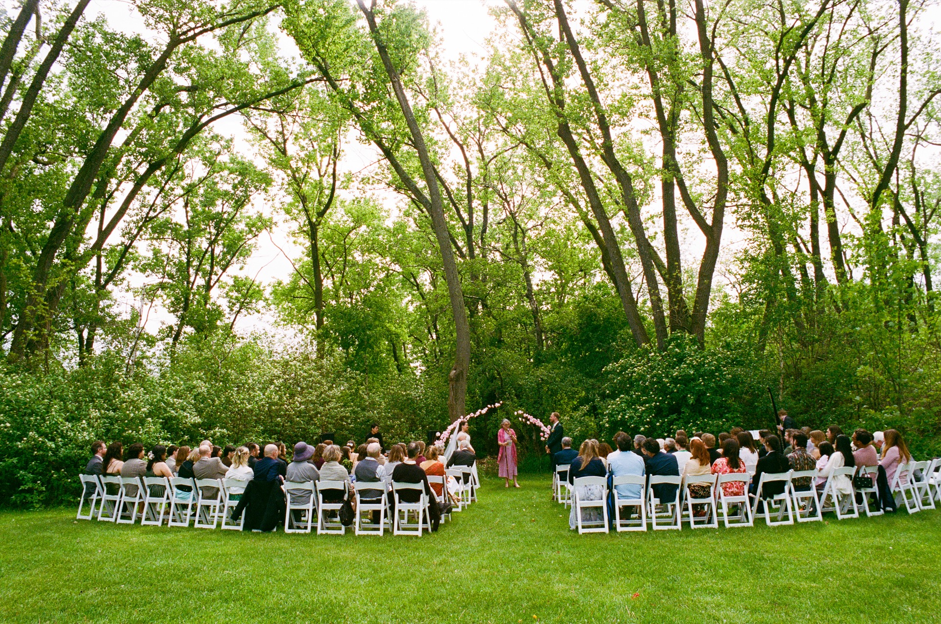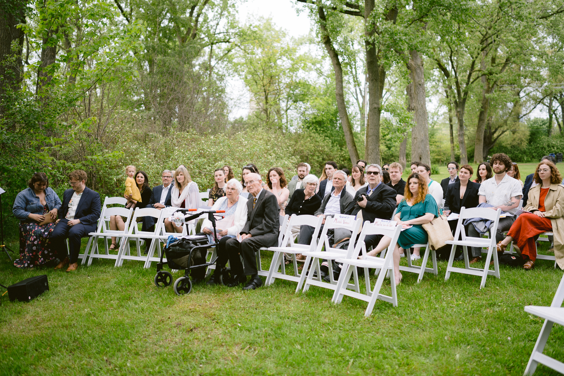 With the rain subsiding, Sam and Arie made the brilliant decision to move the ceremony back outdoors. The lush greenery and serene surroundings of Toronto Island provided the perfect backdrop for their intimate celebration. About 80 guests, all eager and excited, gathered to witness the union of these two wonderful people.