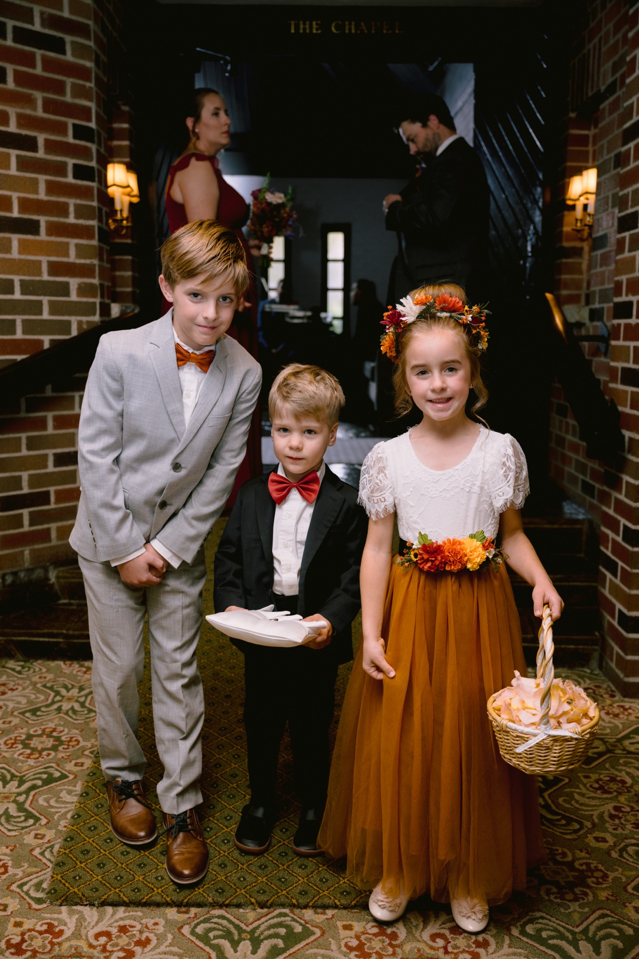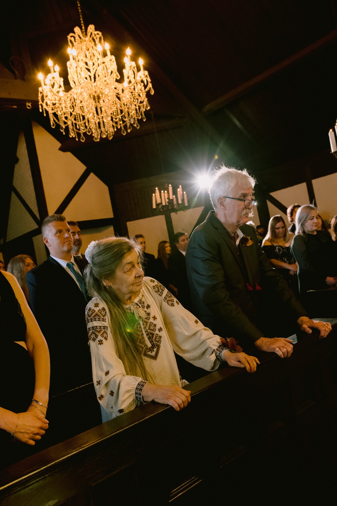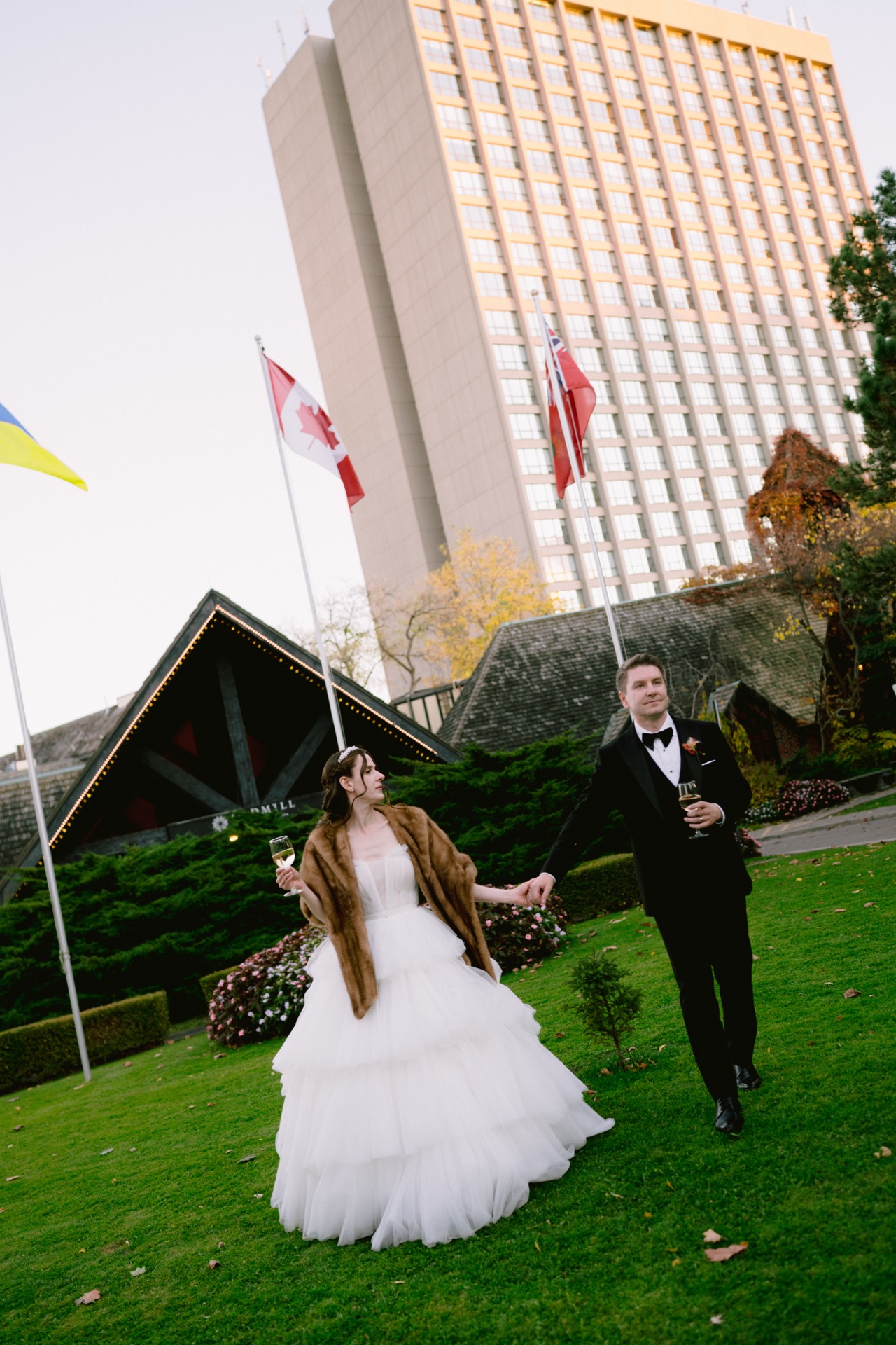 The ceremony took place in the beautiful chapel attached to Old Mill Toronto. The intimate setting, combined with the warm glow of candlelight, set the perfect tone for their heartfelt vows. Following the ceremony, we braved the crisp autumn air for couple portraits. Victoria and Michael wanted to replicate a meaningful photo that Michael’s parents had taken years ago—with the Old Mill Toronto as their backdrop. It was a touching tribute to their family history and a beautiful moment to document.