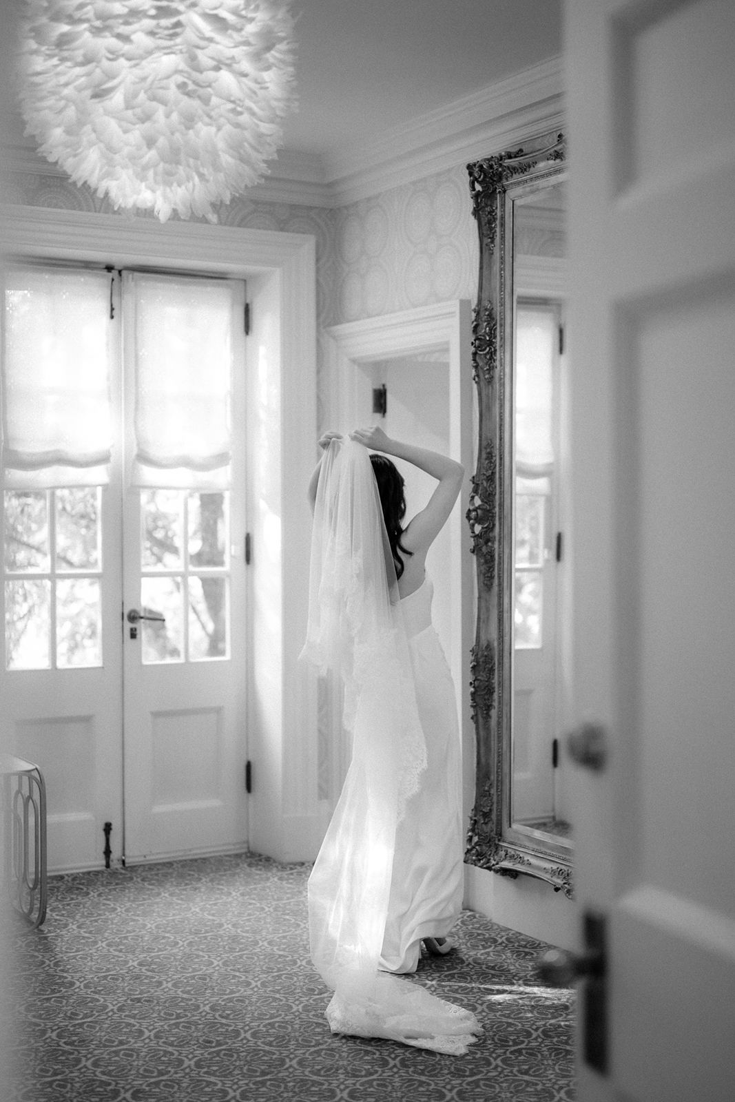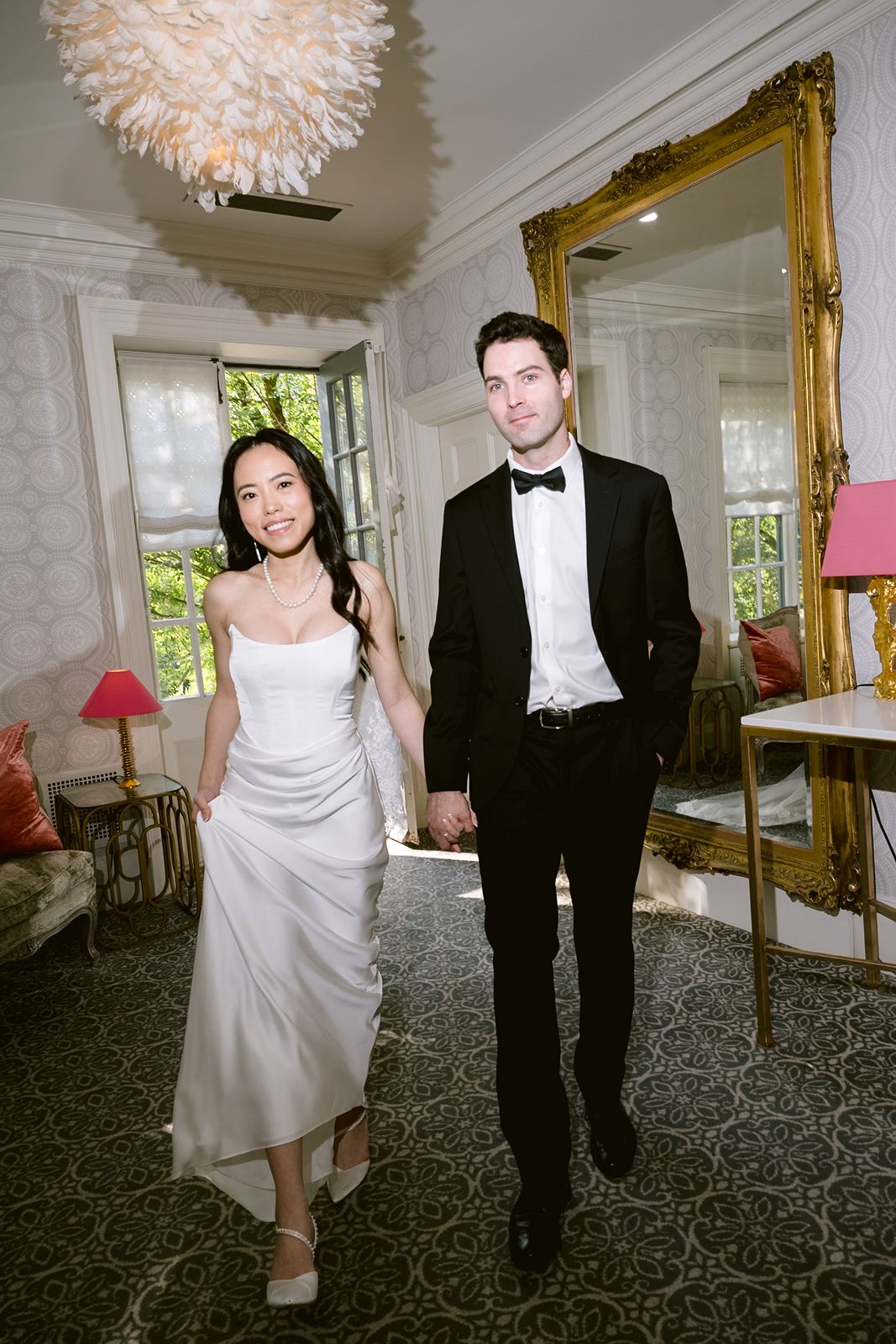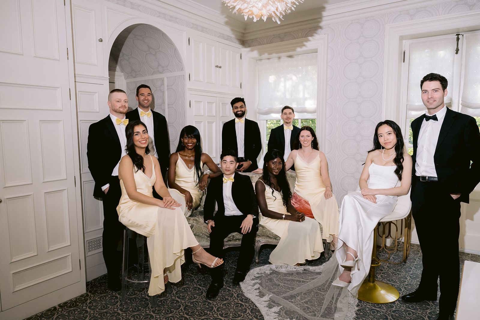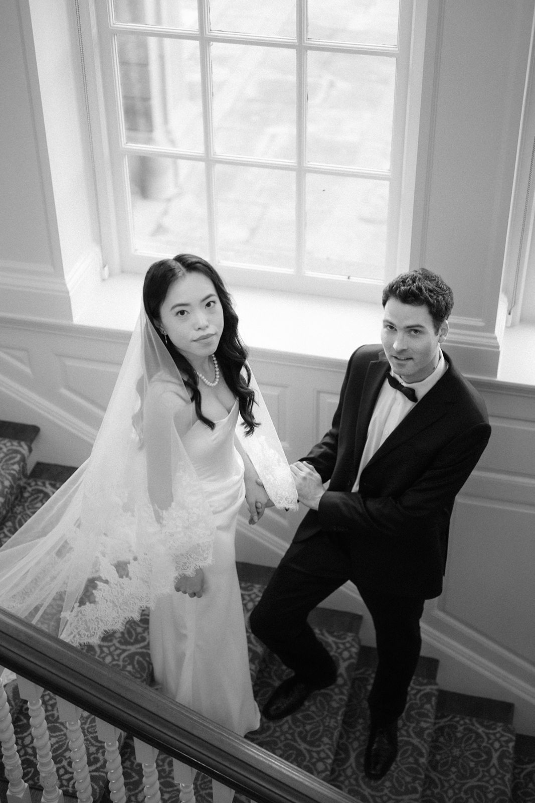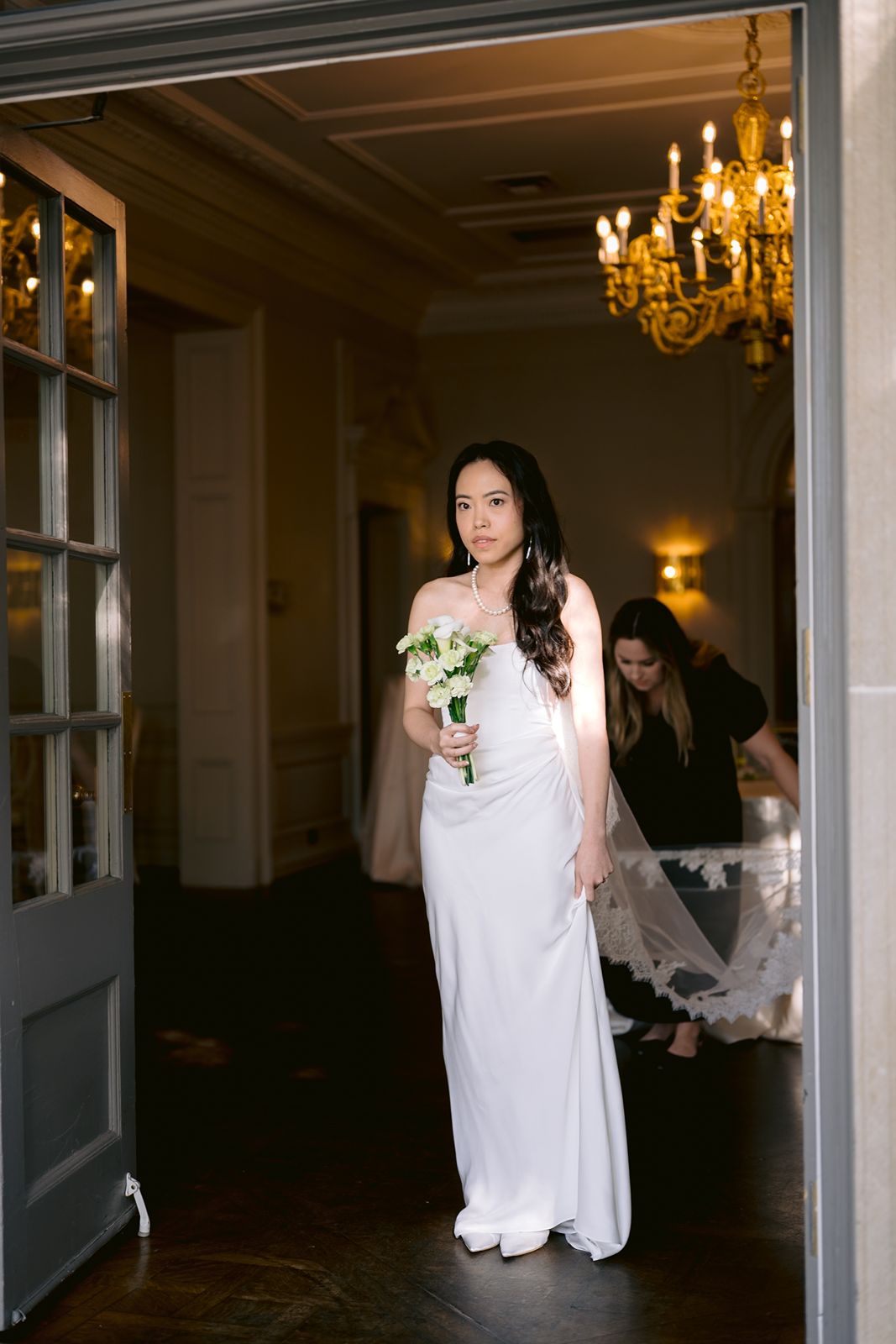 As a photographer, I often look for ways to use the architecture of a venue to enhance the intimacy of a moment. For Nancy and Adrian, I suggested using the grand staircase with its massive, ornate mirror for their first look. To keep the moment private, I had the wedding party “guard” the hallway, ensuring no staff or guests wandered into the frame. Watching Adrian’s reaction through the reflection in the glass was one of the most quiet, editorial moments of the day—unscripted, honest, and still.