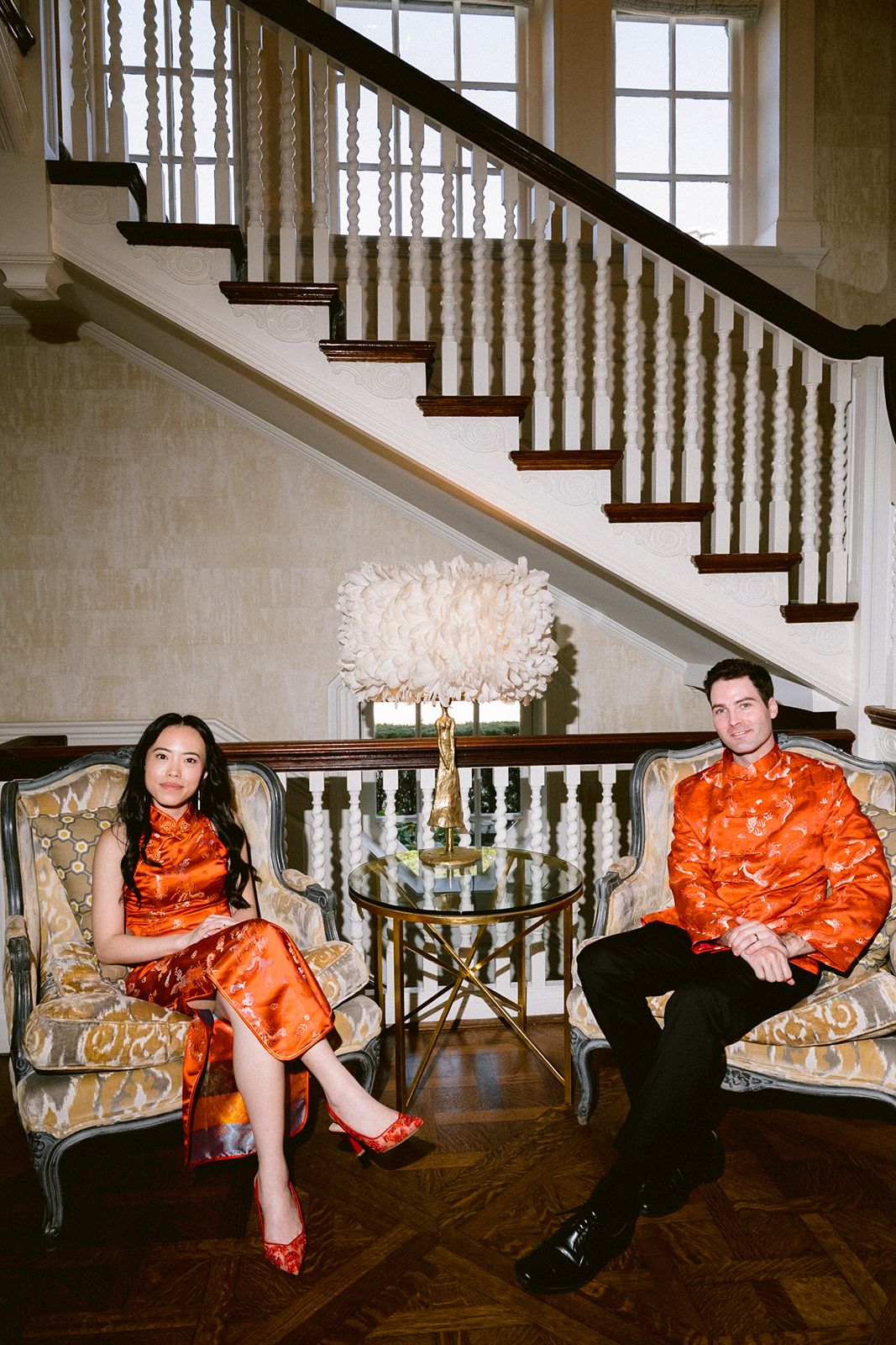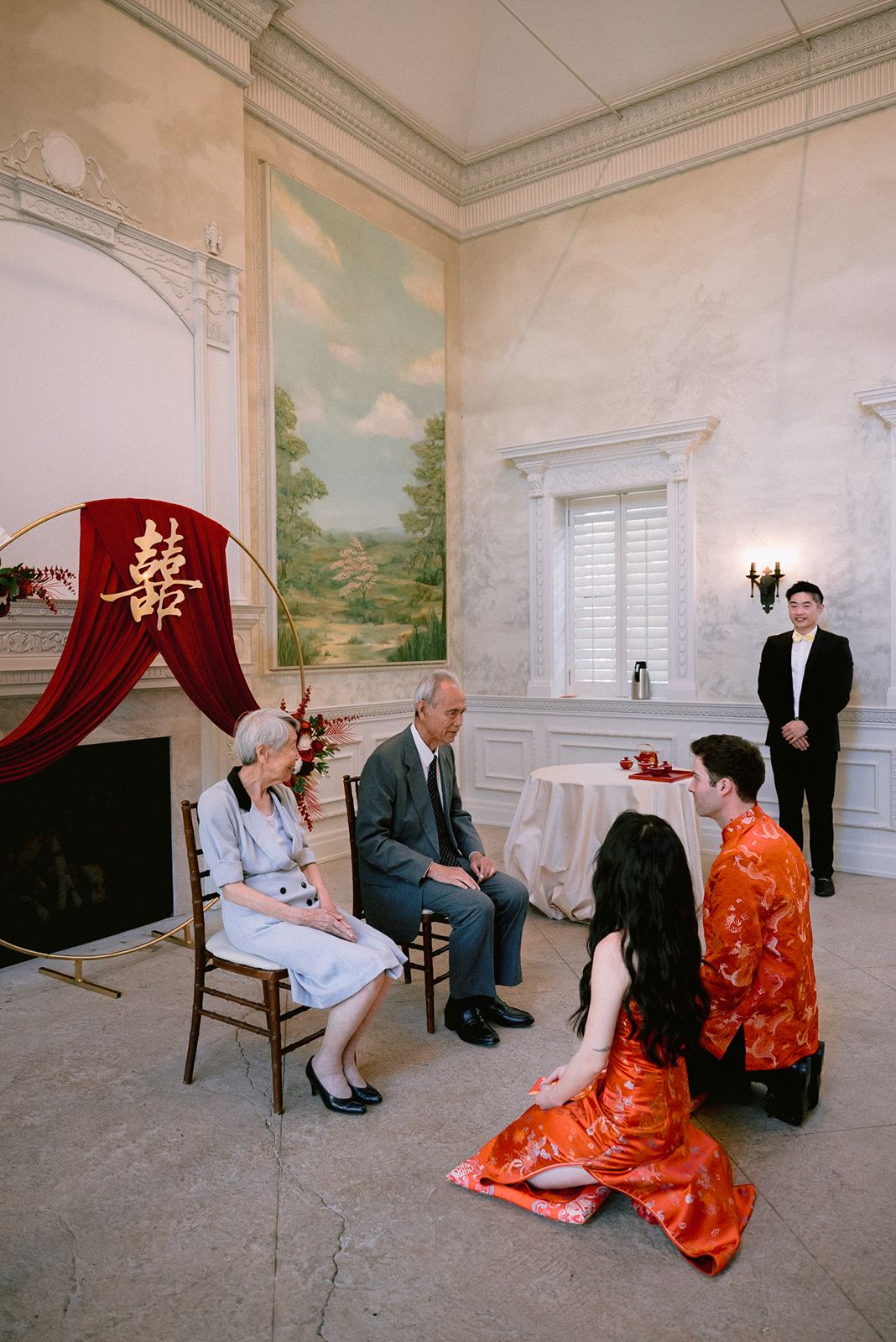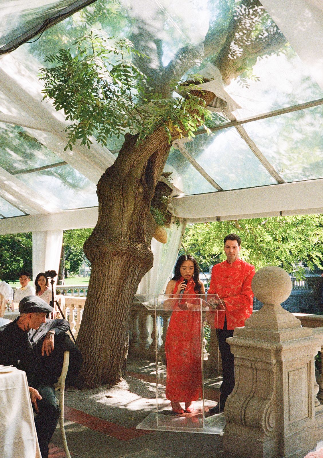 Following the ceremony, the day shifted into a celebration of heritage. Nancy and Adrian stepped away to change into their traditional Chinese outfits, a transition that brought a new layer of depth to their Graydon Hall Manor wedding. Nancy’s red dress was striking—a bold, symbolic color in Chinese culture representing joy and good luck. Seeing the vibrant red against the historic, muted tones of the manor was a beautiful visual reminder of how they carry their history into their new life together.