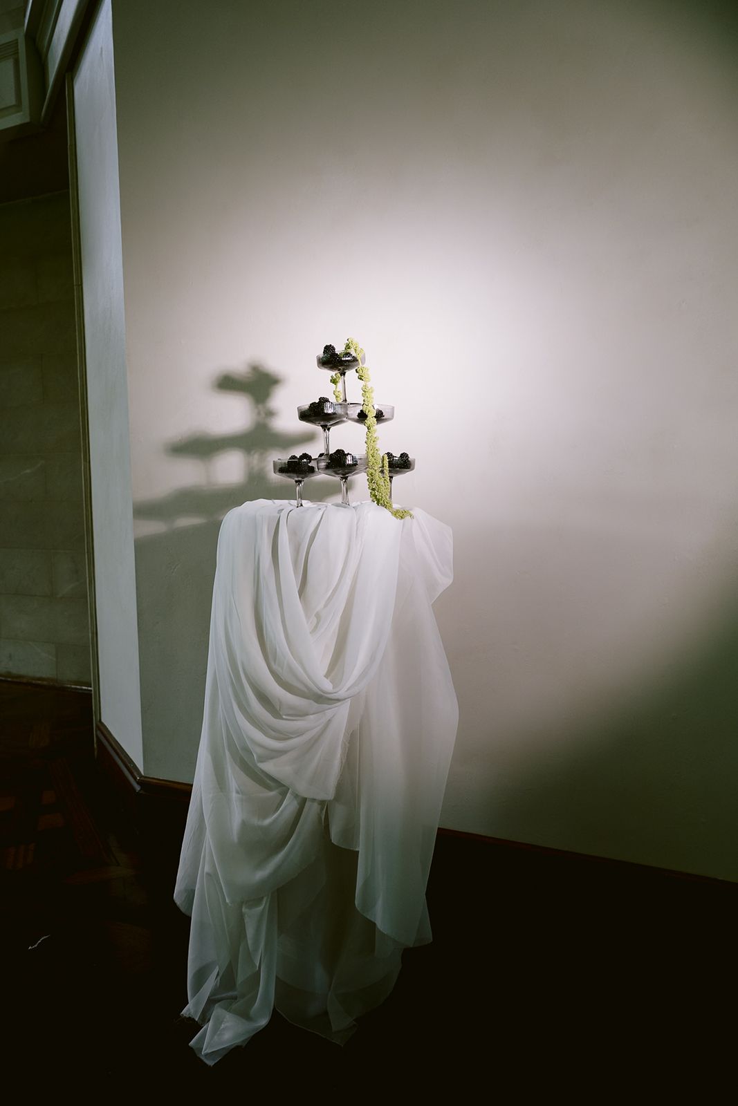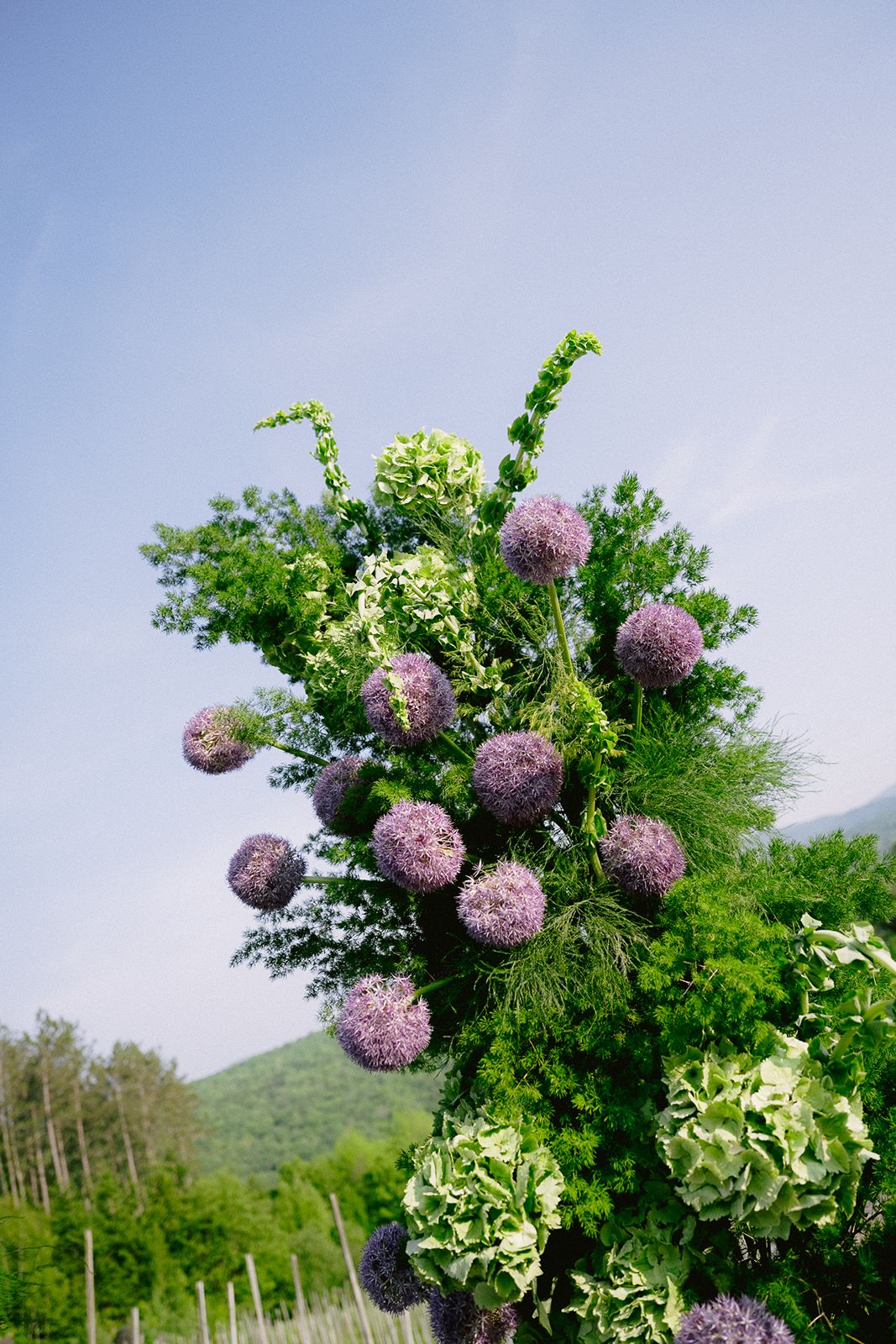 The ceremony took place outdoors, utilizing the estate’s breathtaking landscape as a natural canvas. At the center of the terrace stood a magnificent floral arch, overflowing with cream roses and lush greenery that mirrored the rolling hills of the surrounding vineyards.