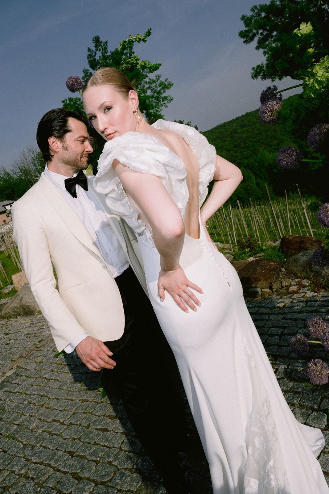 Following the exchange of vows, we wandered through the grounds for a portrait session that felt more like a fashion editorial than a standard wedding shoot. A Chateau Ste Agnes wedding offers an endless variety of backdrops, from the steep, terraced vineyards to hidden stone staircases that feel like they’ve stood for centuries.