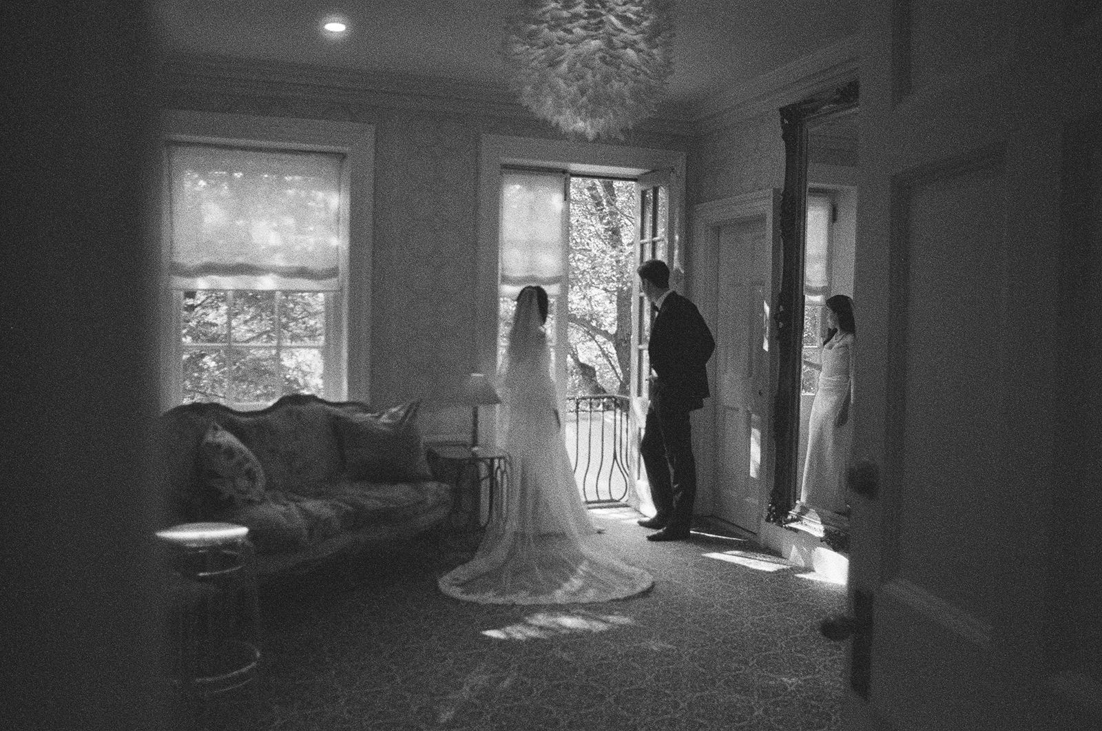 As a photographer, I often look for ways to use the architecture of a venue to enhance the intimacy of a moment. For Nancy and Adrian, I suggested using the grand staircase with its massive, ornate mirror for their first look. To keep the moment private, I had the wedding party “guard” the hallway, ensuring no staff or guests wandered into the frame. Watching Adrian’s reaction through the reflection in the glass was one of the most quiet, editorial moments of the day—unscripted, honest, and still.