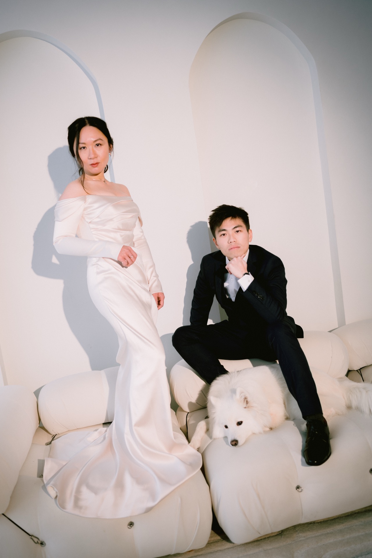 A heartfelt pre-wedding session at Icon Studio Space, Toronto, featuring Shirley, Kelvin, and their adorable 9-year-old dog, Kiro.